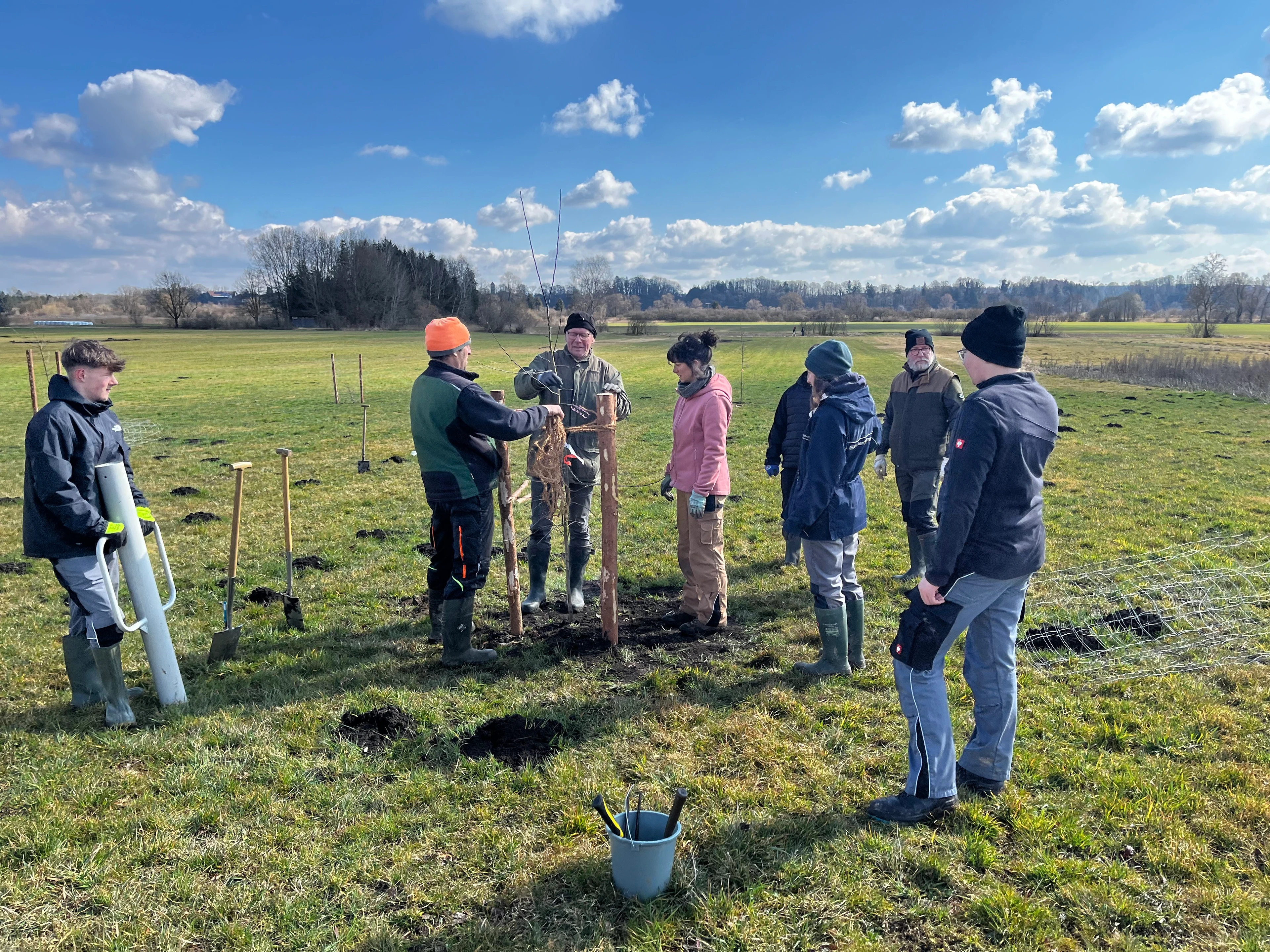 Sieben engagierte Auszubildende von Champignon-Hofmeister übernahmen gemeinsam mit Fachkräften der Günztalstiftung die Pflanzarbeiten. Gepflanzt wurden rund 100 heimische Wildgehölze, die sich künftig zu einem vielfältigen Feldgehölz und einer Wildobstwiese entwickeln sollen.
